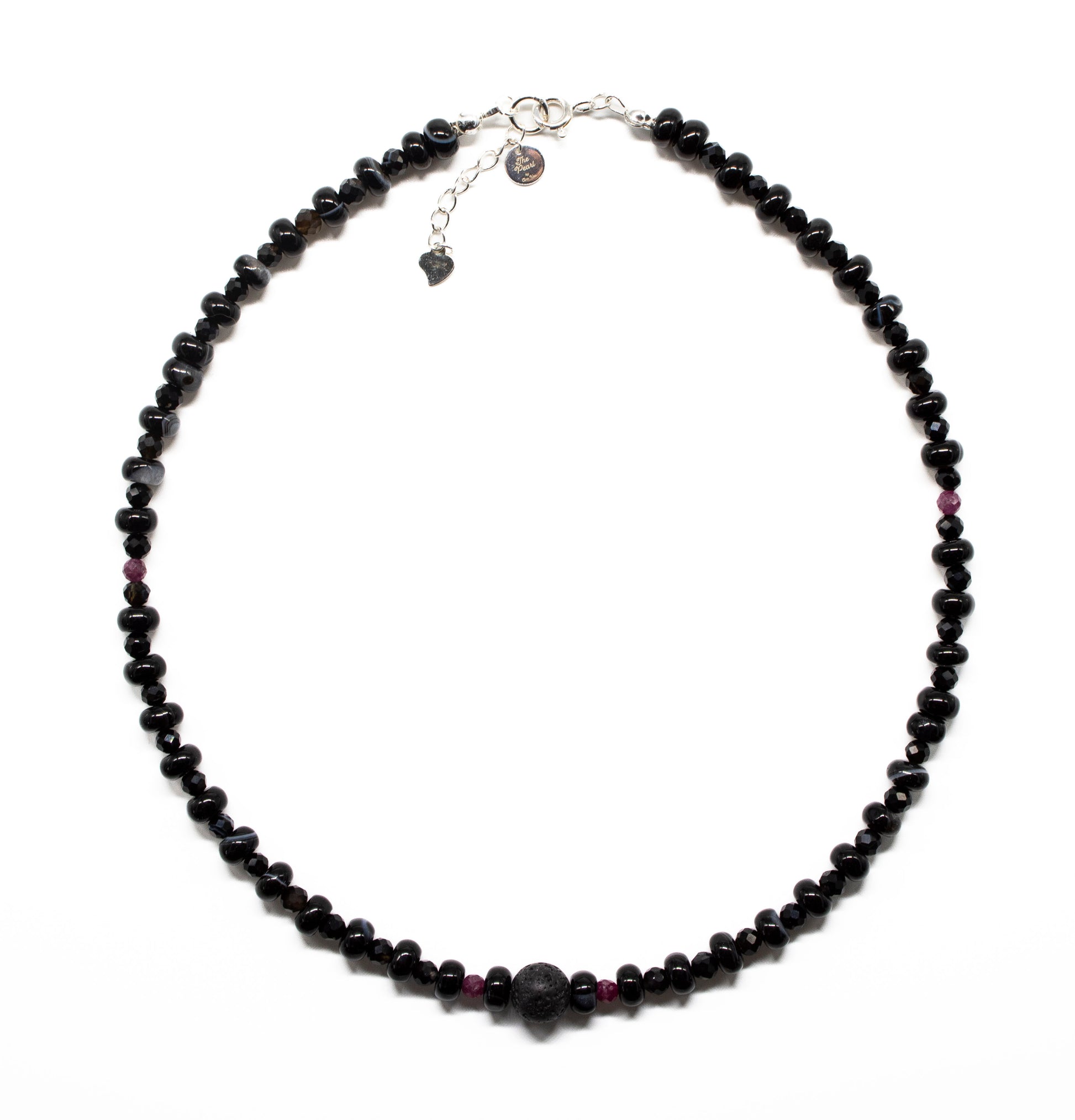 Experience the captivating beauty of this thoughtfully designed necklace, where a glowing lava stone is gracefully accompanied by sparkling rubies, protective agate, and Indian sterling silver. This harmonious combination creates a powerful symphony of healing energies that celebrates natural strength, passionate courage, and inner beauty.