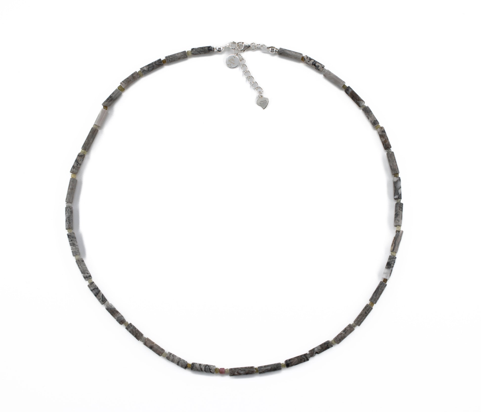 Jasper - The stabilizing foundation that brings emotional, physical, and intellectual balance while providing grounding and inner calm. The patterned jasper beads introduce an organic element that contrasts against the sparkling diamonds and tourmaline, creating harmonious balance between rawness and refinement.